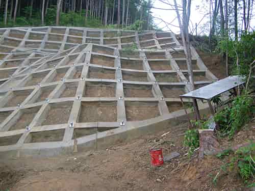 斜面の樹木などの植生がもつ斜面安定効果を活かして補強材と地山の相互作用によって、自然斜面全体の安定性を高める工法で、補強材、グラウト、支圧板、頭部連結材によって構成されます。